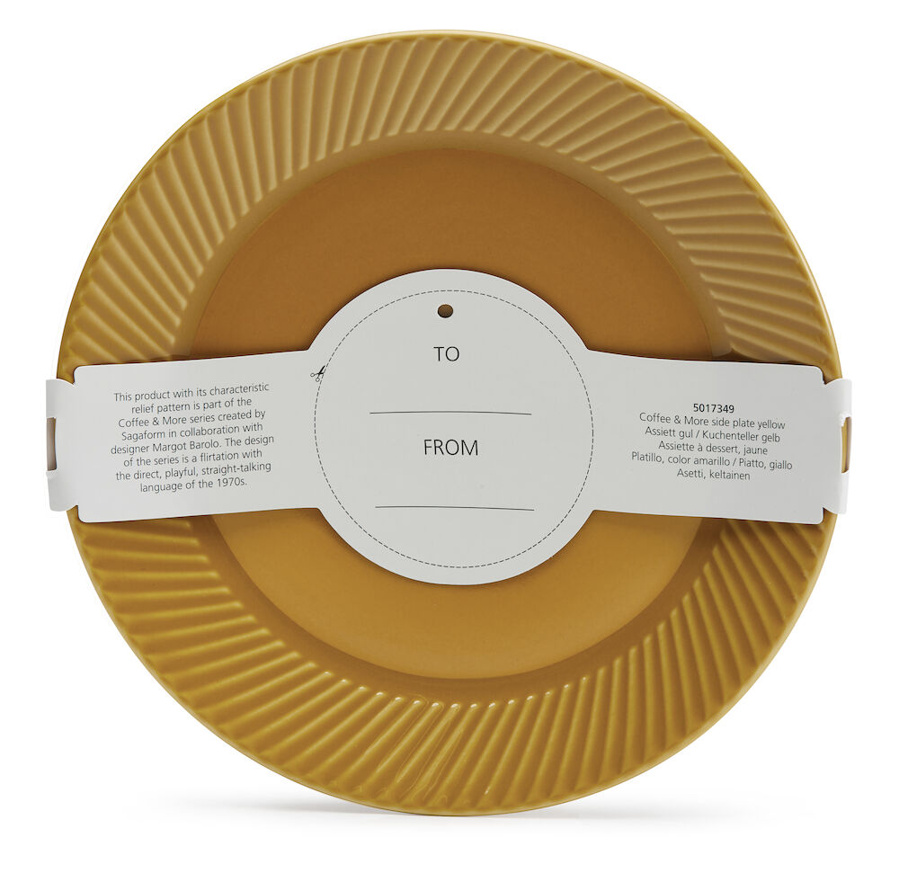 Assiett med karakteristisk relief. Tallriken är en del i serien Coffee & More, framtagen av Sagaform i samarbete med designern Margot Barolo. Seriens design är en flört med 70-talets direkta, lekfulla och raka språk. Serien finns i olika delar, mönster oc