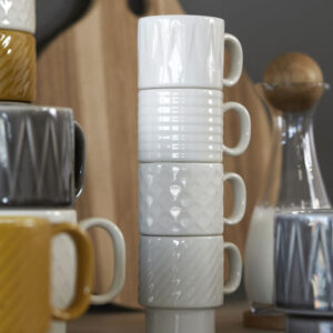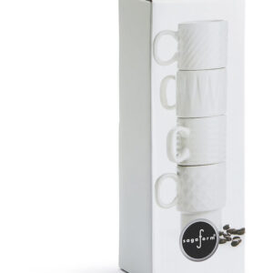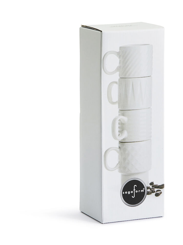 Espressomugg 4-pack med karakteristisk relief. Espressomuggen är en del i serien Coffee & More, framtagen av Sagaform i samarbete med designern Margot Marolo. Seriens design är en flört med 70-talets direkta, lekfulla och raka språk. Serien finns i olika