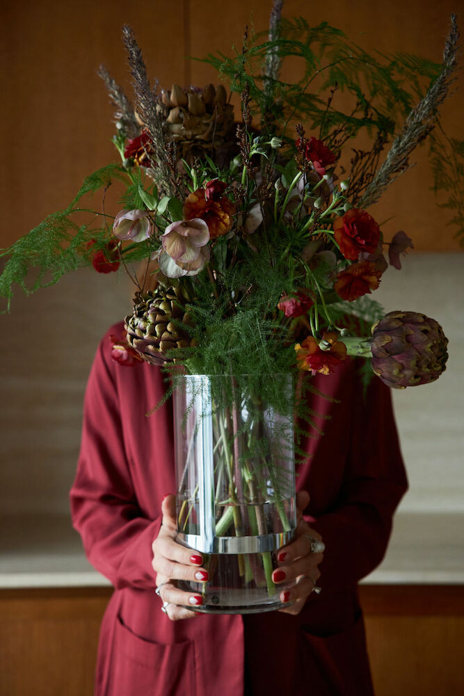 Hold är en unik, prisbelönad, vas designad av Pascal Charmolu. Vasen består av munblåst glas och ett metallhölje som går att justera i höjdled. Genom att enkelt flytta metallhållaren upp eller ner anpassar man höjden till allt från mindre buketter till hö