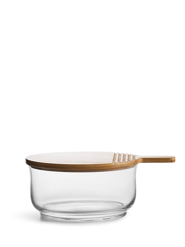 Ett multifunktionellt serveringsset av glas och bambu designat av Anton Björsing. Bambudelen fungerar som lock, skärbräda och serveringsbricka. Smidigt att bara kunna lägga på locket och ställa in eventuella rester i kylen igen. Bambu är en snabbväxande o