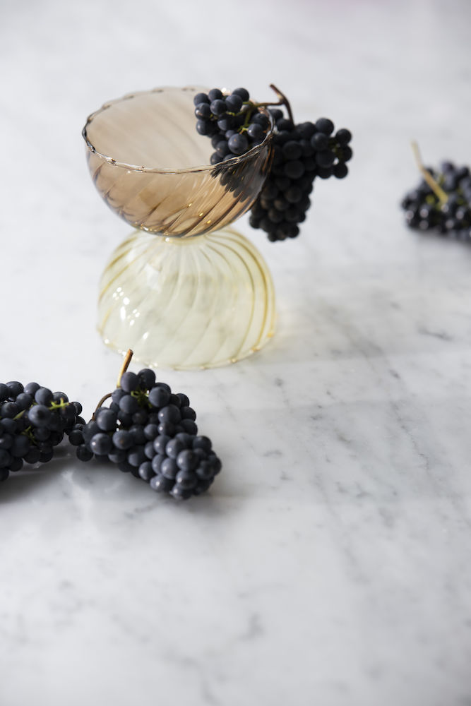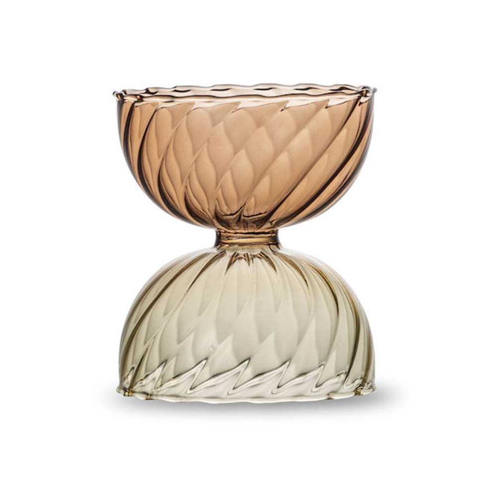 En liten skål i färgat glas. Ränderna i glaset ger liv, och de nedtonad bruna tonerna får oss att tänka på rökigt glas och smörkola.