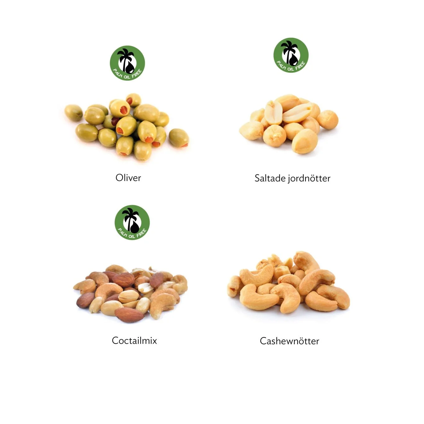 Smaker: Oliver, Coctailmix, Saltade jordnötter, Cashewnötter